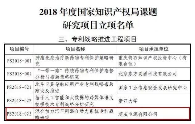 国家知识产权局发布“2018年度国家知识产权局课题研究项目立项名单”,由超威集团申报的“混合动力汽车用混合动力系统专利战略研究”课题入选专利战略推进工程,成为全国唯一入选该战略工程的电池企业。