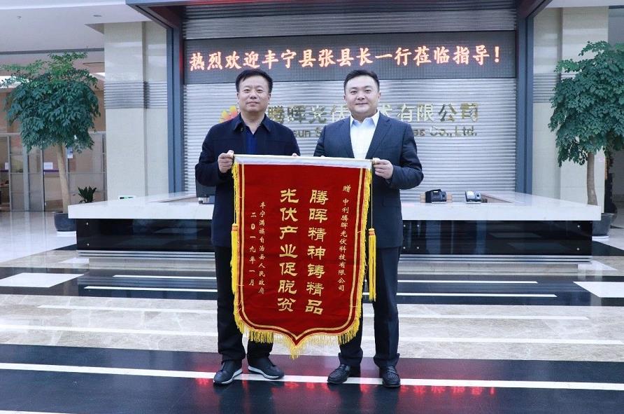 近日,河北省丰宁满族自治县副县长张立民一行莅临苏州腾晖光伏技术有限公司调研指导工作,并赠与腾晖光伏“腾晖精神铸精品 光伏产业促脱贫”锦旗,以感谢腾晖光伏长期以来帮助丰宁县脱贫攻坚做出的努力和贡献。江苏中利集团股份有限公司总经理王伟峰接待张立民一行并举行洽谈会晤。