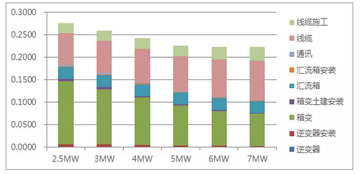相比1000V系统,1500V系统交直流侧电压升高后,逆变器功率密度提高,单体功率增大,随之最佳经济方阵容量增大,且交流侧变压器、环网柜等设备成本也会下降。此外,方阵容量增大后,电站逆变器、变压器等设备数量减少,安装维护成本降低,站内高压线路减少,线缆和施工成本进一步降低,从而降低电站系统成本,提高电站收益。