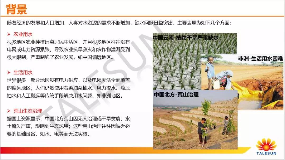迄今为止世界各地仍然有相当大一部分地区没有电力供应,以及电网无法全面覆盖的偏远山区,人们仍然使用着柴油泵抽水、风力提水、液压抽水和人工搬运等传统手段解决用水问题。因为没电,这些地方的人们生活困难,饮水困难,灌溉困难等问题较为突出。