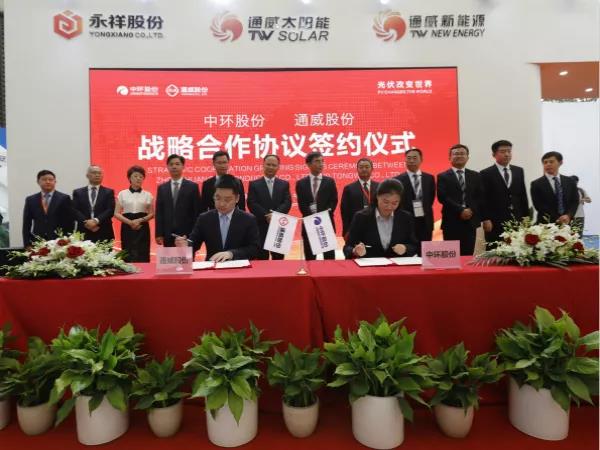 恰逢SNEC第十二届(2018)国际太阳能光伏与智慧能源(上海)大会暨展览会期间,中环股份与通威集团本着平等互利、绿色发展、同等优先的原则,就多晶硅料、单晶硅片、太阳能电池等方面进行产业链合作,签订《光伏产业链合作框架协议》。