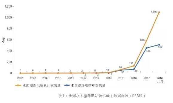 近日,新加坡太阳能研究所(SERIS)发布的一份报告显示,截至2018年9月,全球水面漂浮电站项目装机量大幅增长,累计装机量近1.1GW。报告指出,欧美、亚洲的许多国家都在大力发展水面漂浮电站,尤其是近年来东南亚、南亚等新市场的逐步兴起,带动了全球水面漂浮电站装机容量和每年新增太阳能发电量呈指数增长(图1)。其中,阳光电源浮体及漂浮系统解决方案全球应用规模达400MW,占全球总装机量的三分之一以上。