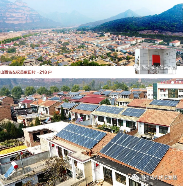 中国武警总部作为麻田村的帮扶单位,陆续为麻田村218户贫困家庭装上了屋顶光伏电站助力革命老区脱贫。项目选用固德威GW5000D-NS智能光伏逆变器,5KW的光伏发电系统每年都会为贫困户带来大约7000元的收入,2018年麻田村光伏扶贫电站也成为中国精准扶贫的生动实践样本登上了央视。
