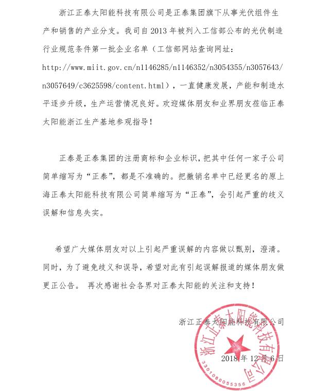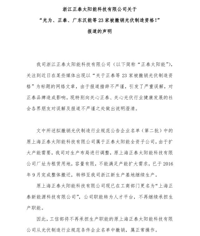 我司浙江正泰太阳能科技有限公司(以下简称“正泰太阳能”),关注到近日在某些媒体出现以“关于正泰等23家被撤销光伏制造资格”为标题的网络文章,由于报道措辞不严谨,引发了严重误解,对正泰品牌造成影响。现特别向关心正泰、关心光伏行业健康发展的社会各界朋友对误解及报道不严谨之处做出说明澄清。