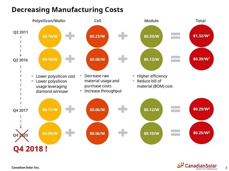 2016年我也给出了成本方面的预测(预测2 图)。直到2017年第四季度,我的预测都被证明是相当准确的,包括准确地预测到制造成本将下降到每瓦25美分,但实现这个成本的具体时间和我当时的预想有点偏差。实际上,到2018年第四季度,行业主流厂家的组件制造成本就能达到每瓦25美分,而不是2020年第四季度。