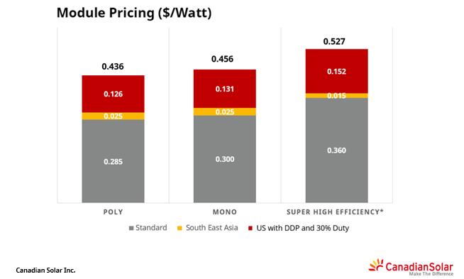 不幸的是,我们的美国客户并没有从下降的成本中获益。原因在于美国政府设置了贸易关税。组件在第三国生产的额外成本和“201”保障措施关税叠加,美国客户每瓦要多支付15-17美分(上图所示)。