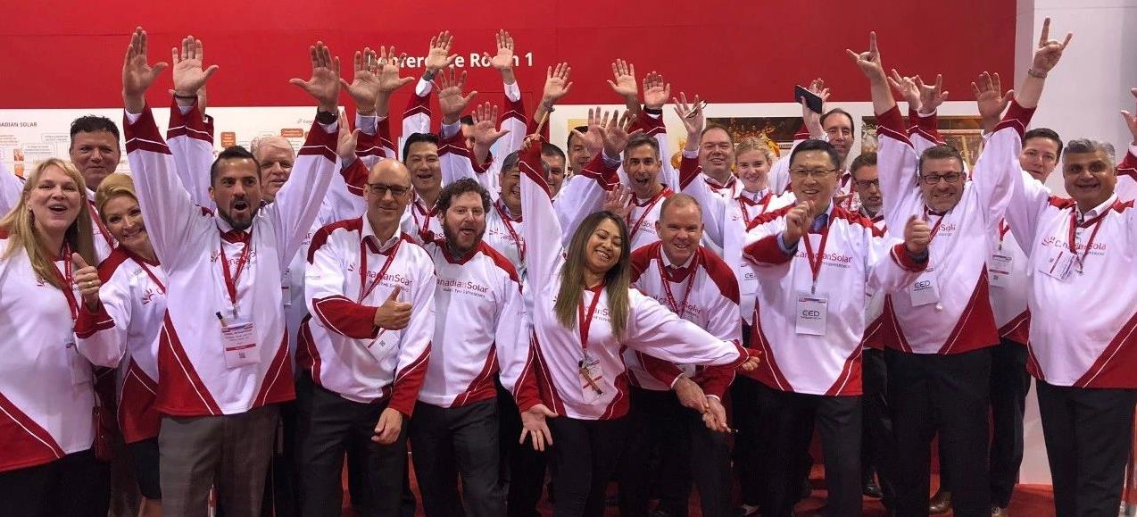 瞿晓铧董事长(右三)和阿特斯员工在2018美国SPI展会上