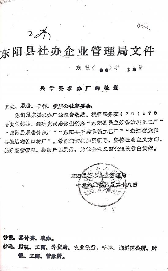 关于创办浙江省东阳县横店磁性器材厂的批复