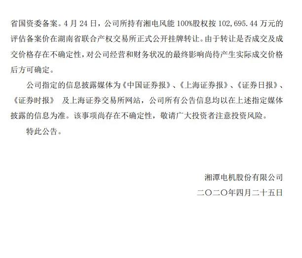 湘电风能100%股权近日正式在湖南联交所挂牌转让,底价是10.27亿元,截止时间为5月25日。2019年湘电风能资产总额为67.82亿元,年营收15.40亿元,净利润-9.38亿元。2020年第一季度,营收2.54亿元,净利润为-4842.13万元。