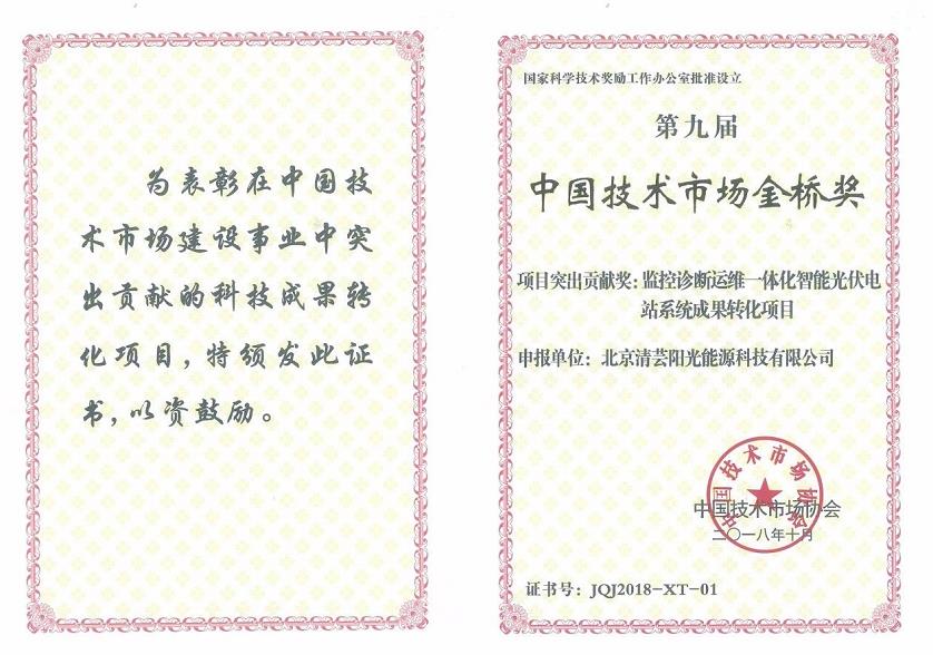 10月31日,第九届中国技术市场协会金桥奖颁奖大会在北京举行,清芸阳光“监控诊断运维一体化智能光伏电站系统”(SOLARULE系统)最终斩获中国技术市场金桥奖项目突出贡献奖,并在同类奖项中荣获第一名。
