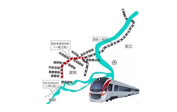 杭州地铁6号线一期工程线路长度约为27km,全部是地下线,共设车站19座,其中换乘站6座,分别与杭富市域线、1、2、4、5、7号线换乘。杭州至富阳城际铁路工程起始于在建杭州地铁6号线美院象山站,线路途经之江度假区、富阳银湖街道、富阳富春街道,线路全长23.508km,11座车站,均为地下站。项目通车后,从富阳到杭州主城区用时将缩短至30分钟,根本上改变富阳区单一的公共交通运输现状,推动富阳区融入杭州主城区,带动富阳经济发展。