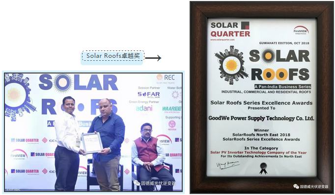 随着国内政策的松动,光伏市场有回暖迹象,而国际市场也在如火如荼的持续推进中,固德威在此种市场形势下稳步前进。近期,在国际市场传来好消息,固德威凭借在印度市场的长期积淀和良好的客户口碑,在2018 SolarRoofs North East 评选中获得了Solar Roofs系列卓越奖,成为印度市场最受欢迎的光伏逆变器品牌。