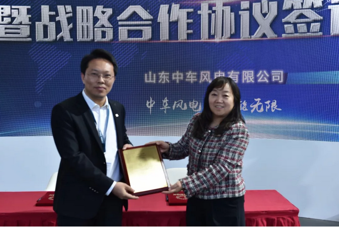 在3.6MW-4MW风电机组CQC认证颁证仪式暨战略合作协议签订仪式上,中车山东公司副总经理耿家声发表致辞,中国质量认证中心市场总监兼新能源产品认证处处长邢合萍为山东中车风电有限公司颁发3.6MW-4MW风电机组CQC认证证书,山东中车风电有限公司副总经理于良峰代表公司签署战略合作框架协议,公司董事长吴树梁见证仪式。