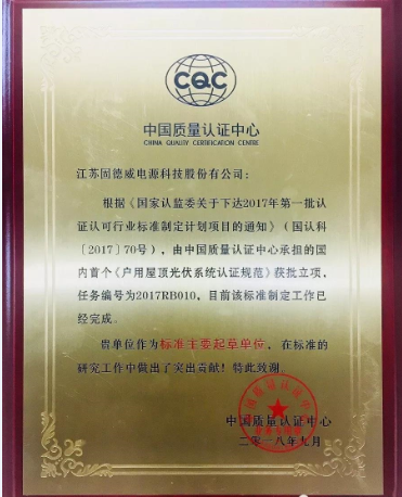 ▲固德威参与由CQC承担《户用光伏系统认证规范》的起草,并被授予奖牌