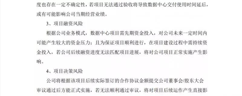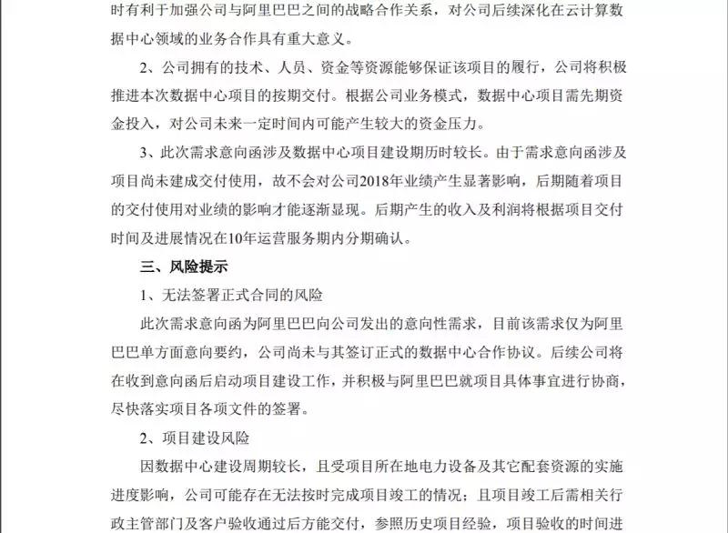 公告称,这是双方的首次数据中心项目合作,投入的具体领域为数据中心基础设施相关的专用系统的采购及建设,预计投入金额为5.5亿元,在十年运营期内通过向阿里巴巴收取云数据中心托管服务费的方式分期收回投资。