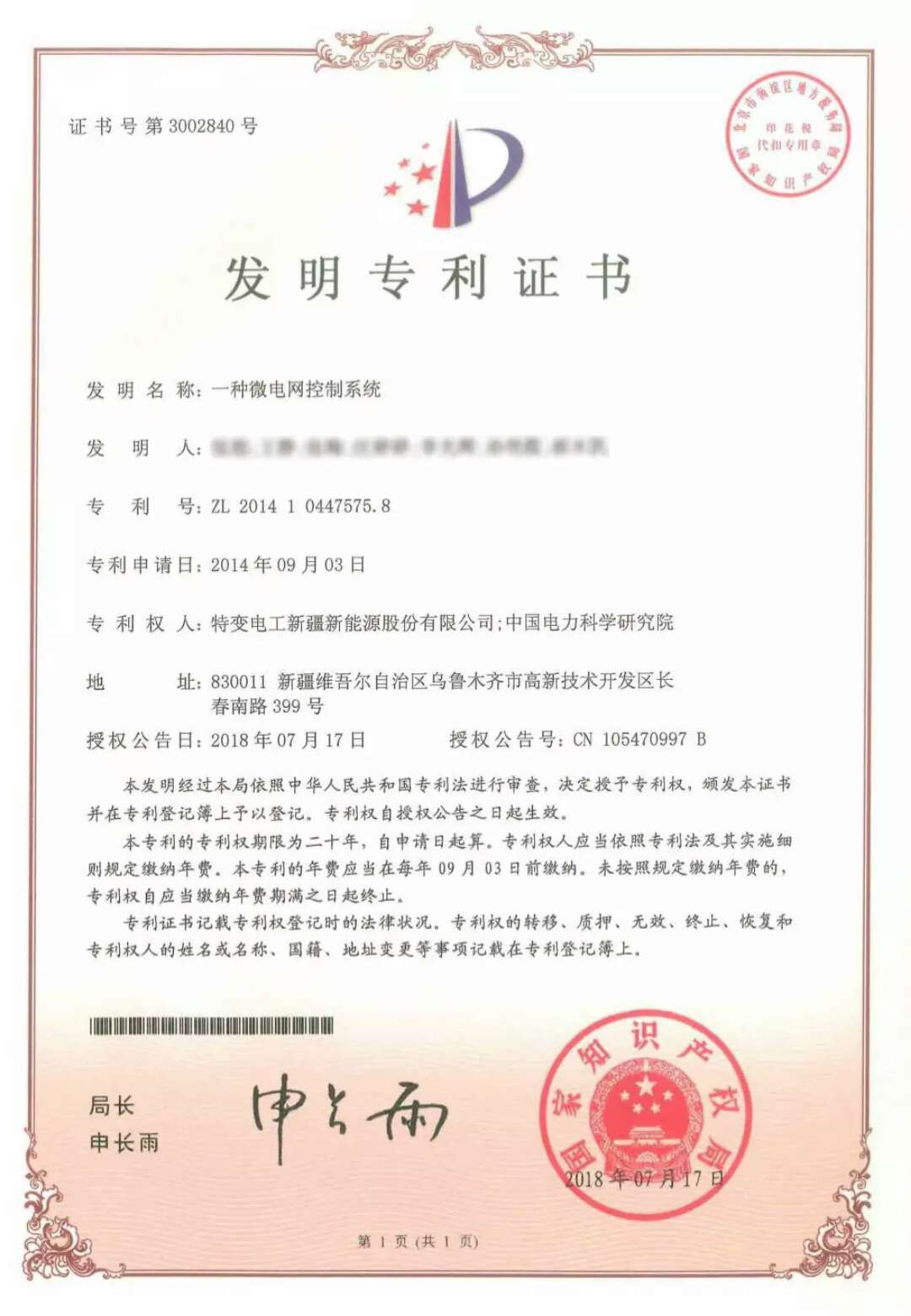 近日,由特变电工申请的发明专利“一种微电网控制系统”,通过了国家知识产权局为期三年的实质审查工作,顺利取得发明专利证书。这是特变电工在微电网领域首个发明专利,标志着特变电工在微电网领域的技术创新工作又登上了一个新的台阶。