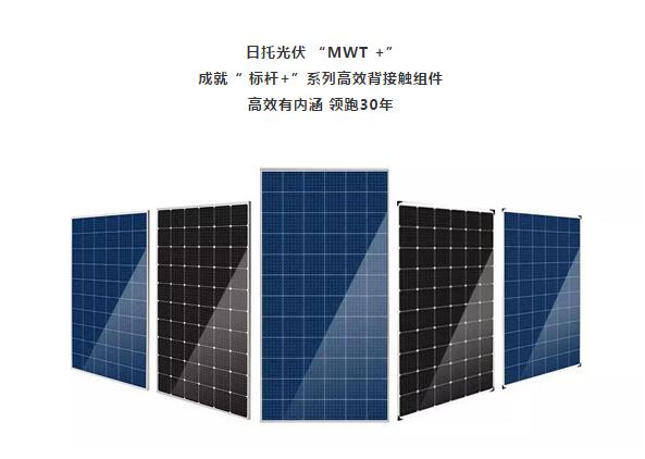 日托光伏高效背接触组件又被称之为四高组件,具有高可靠性、高转化率、高寿命、高颜值的产品特点,2018年,日托光伏提出“MWT+”技术路线。