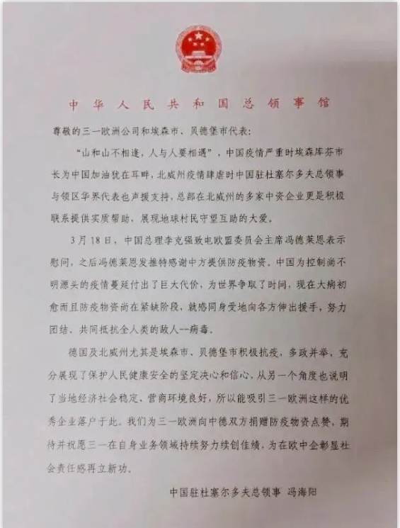 中国驻杜塞尔多夫总领事冯海阳向三一欧洲发函表示感谢,为三一“点赞”