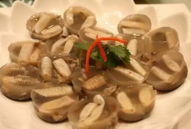 土笋是一种形似蚯蚓的软体动物,满是胶质。熬煮入模具冷冻,成型后剪成小块,搭配酱油、永春醋、甜辣酱、芥辣、蒜蓉、海蜇及香菜、白萝卜丝、辣椒丝、番茄片。