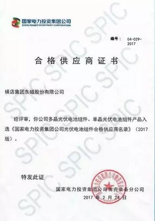 (3)横店东磁成功入选2017《国家电力投资集团公司光伏电池组件合格供应商名录》。此次国家电力投资集团公司光伏电池组件供应商资格评审招标于2016年10月21日发布,同年12月截止申报进行评议工作。在2017年3月份国电投2017年度第十批集中招标(第一批光伏电池组件设备)采购招标中,国家电投对光伏组件采购容量为550MW,储备容量550MW,其中500MW的采购容量要求投标人资质为必须在2017《国家电力投资集团公司光伏电池组件合格供应商名录》中。由此,此次横店东磁入围,对于日后东磁太阳能与大型国企展开合作交流打开了重要的篇章。