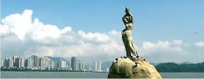 珠海渔女是珠海市的象征,位于珠海风景秀丽的香炉湾畔,矗立着一尊巨型石雕——珠海渔女,她领戴项珠,身掮渔网,裤脚轻挽,双手高高擎举一颗晶莹璀璨的珍珠,带着喜悦而又含羞的神情,向世界昭示着光明,向人类奉献珍宝。