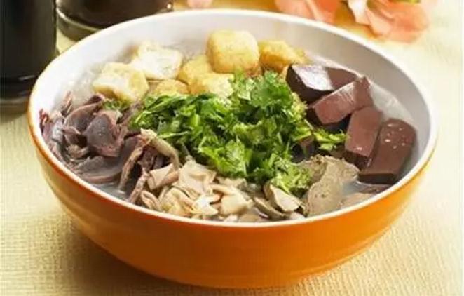 鸭血粉丝:在南京,卖鸭血汤的摊子星罗棋布。精明的摊主预先将鸭血煮熟,切成小块放在锅中,见有游客来,便捞出鸭血装在白瓷碗里,然后浇上一勺滚烫的鲜汤,滴上数滴香油,撒上一撮虾米或鸭肠衣等,再加上一撮香菜。爱吃辣的客人,还可以再加上些辣椒油或胡椒,又香、又辣、可口的味。