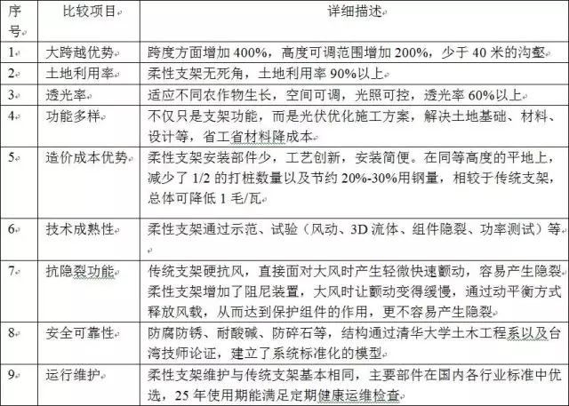 传统支架是将光伏组件安装于刚性支架上,当处于台风等恶劣气候条件下时,光伏组件承受的风压非常大,因此容易脆裂。而柔性支架将光伏组件“悬、拉、挂、撑”在空中,当碰到地震、强风等恶劣气候时,柔性材料自身的弹性可抵消部分外力,阻尼装置可进一步减小振荡,避免可能产生的共振,从而将损失降到最低。