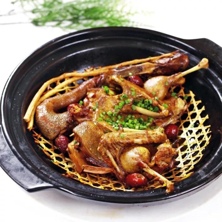 厦门姜母鸭以红面番鸭为原料,用芝麻油将鸭肉炒香后,再加入老姜(姜母)及米酒等炖煮而成。成菜味道鲜香,甘辛兼备,且具有疏肝润肺、养胃健脾、舒筋活血、祛寒化痰等功效。