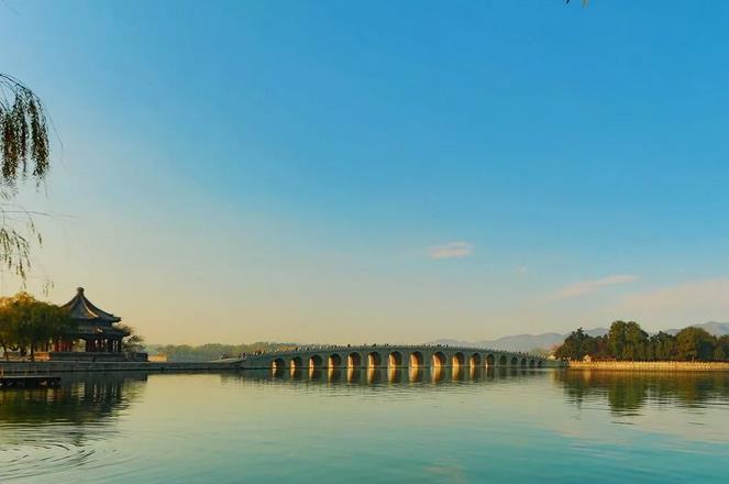 颐和园,中国清朝时期皇家园林,前身为清漪园,坐落在北京西郊,距城区十五公里,占地约二百九十公顷,与圆明园毗邻。它是以昆明湖、万寿山为基址,以杭州西湖为蓝本,汲取江南园林的设计手法而建成的一座大型山水园林,也是保存最完整的一座皇家行宫御苑,被誉为“皇家园林博物馆”,也是国家重点旅游景点。