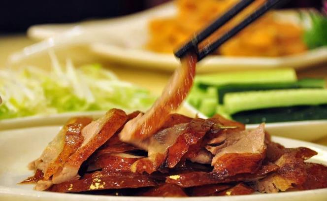 烤鸭是具有世界声誉的北京著名菜式,起源于中国南北朝时期,《食珍录》中已记有炙鸭,在当时是宫廷食品。用料为优质肉食鸭北京鸭,果木炭火烤制,色泽红润,肉质肥而不腻,外脆里嫩。北京烤鸭分为两大流派,而北京最著名的烤鸭店也即是两派的代表。它以色泽红艳,肉质细嫩,味道醇厚,肥而不腻的特色,被誉为“天下美味”。
