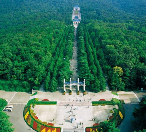 中山陵自1926年春动工,至1929年夏建成。面积共8万余平方米。主要建筑有:牌坊、墓道、陵门、碑亭、祭堂和墓室等。从空中往下看,中山陵像一座平卧在绿绒毯上的“自由钟”。山下中山先生铜像是钟的尖顶,半月形广场是钟顶圆弧,而陵墓顶端墓室的穹隆顶,就像一颗溜圆的钟摆锤。