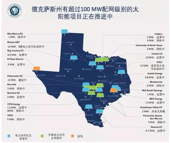 德克萨斯州大多数太阳能项目均为电力公司规模,即在空旷的土地上安装的大规模太阳能光伏阵列,通过高压传输线路将太阳能电力输送到达拉斯、休斯顿、奥斯汀和圣安东尼奥等城市。不过现在,一种不同的太阳能发展形式正在迅速崛起。这种形式是由地方电力合作社和市政电力公司主导,购买在城市郊区安装的连接配电网的装机规模在1到10 MW之间的“配网级别”太阳能光伏项目。德克萨斯州20多家小型电力公司已开始发展配网级别太阳能项目,总装机规模达100 MW左右,相当于一家小型天然气发电厂的发电规模。
