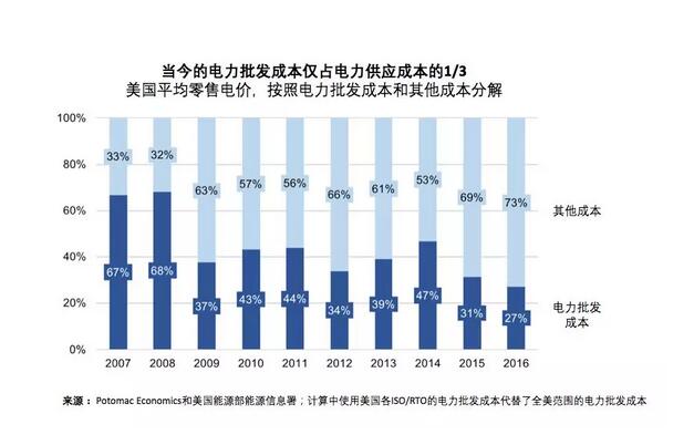 电力系统输电成本增加的同时,得益于能效技术的广泛应用,全美用电总量从2007年起就一直保持平稳。当不断增加的基础设施成本分摊到固定的电量时,每千瓦时电量的成本就相应提高了。事实上,尽管发电成本降低,美国平均零售电价却从2007年的每千瓦时9.1美分增长到了2016年的每千瓦时10.3美分。