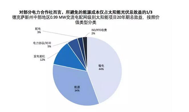 如果被太阳能替代的电力越来越便宜,太阳能的价值怎么会提高呢?其关键原因在于配网级别太阳能不仅避免了电力批发成本,还节约了其他相关的非能源成本,如配电网络、发电装机等基础设施建造成本,尤其是输电部分。