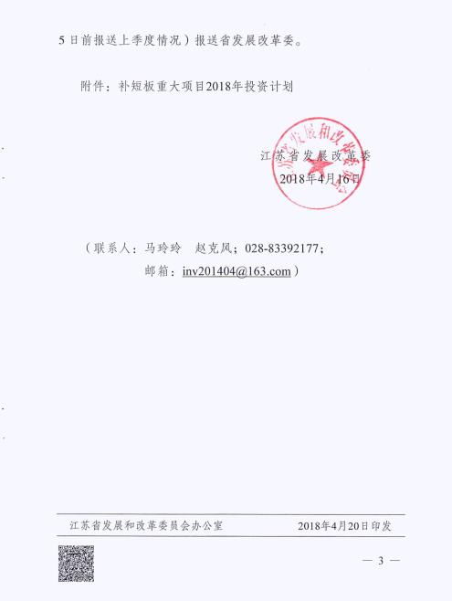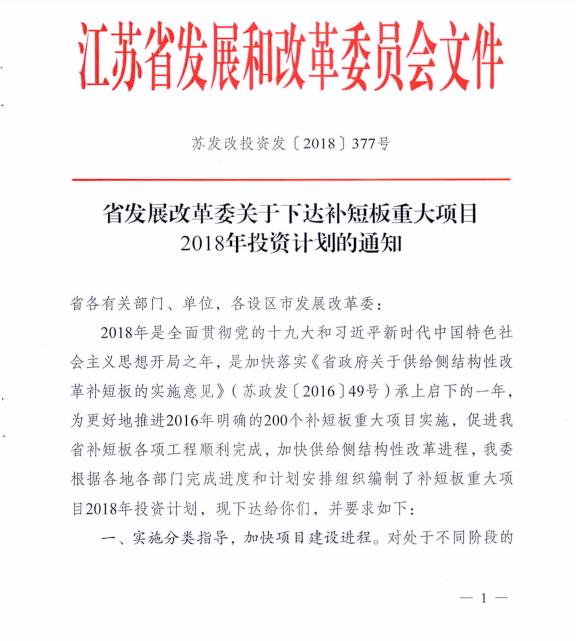 日前,江苏省发展和改革委员会发布《关于下达补短板重大项目2018年投资计划的通知》。
