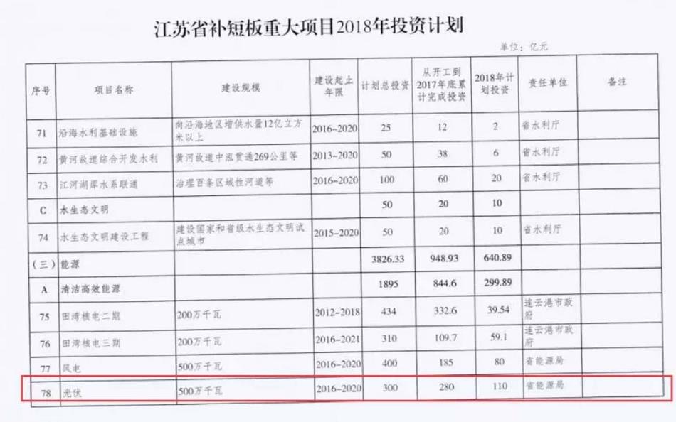 通知指出江苏省2018年下达补短板重大项目投资计划3600亿元。其中光伏被列于“清洁高效能源”之列,从2016-2020年安排总建设规模500万千瓦,计划总投资300亿,2018年计划投资110亿元。