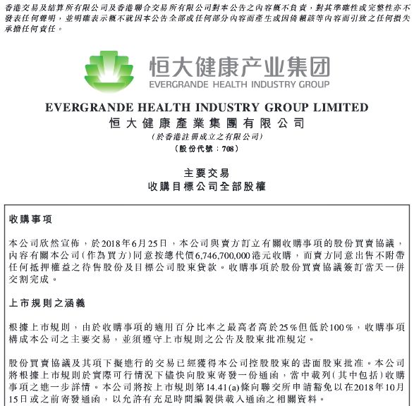 根据此前合资协议,香港时颖公司在2017年11月30日已向Smart King支付8亿美元的投资金额,剩余12亿美元投资将于2019年12月31日及2020年12月31日之前各支付6亿美元。此番恒大健康产业100%收购香港时颖公司后,剩余12亿美元的投资将由恒大健康来接盘,而67.46亿港元(约合8.5亿美元)的收购价格则用于抵偿香港时颖公司此前8亿美元的投资。
