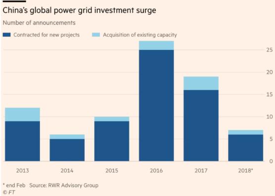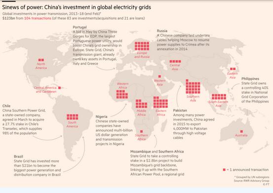 从地理上看,中国最大的电力投资集中在非洲。在截至2018年2月底的5年里,已公布的投资项目达39个。分析人士称,中国计划在非洲各地建设地区电网。中国国家电网已确定将成为一个价值28亿美元的项目的控股股东,该项目将在莫桑比克建设输电主干线,该主干线将接入南部非洲电力联营集团(Southern African Power Pool)——南部非洲国家的电力互联系统。尼日利亚也是一个重点,价值58亿美元的曼比拉(Manbila)水电项目由中国进出口银行提供资金,由中国的企业承建。