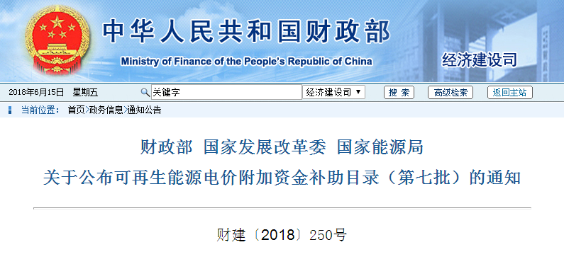 财政部 国家发展改革委 国家能源局 关于公布可再生能源电价附加资金补助目录(第七批)的通知