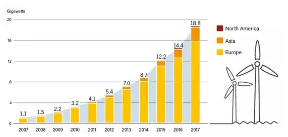 与此同时,随着技术进步带来的成本下降和政策机制设置的完善,海上风电价格下降成为趋势。2017年,德国海上风电项目实行了首个“零补贴”投标项目,此风电场最早将于2024年投产运营;荷兰开展了“零补贴”招标项目,中标项目将执行不高于零售价格的电价。按照GWEC预测,由于行业日趋成熟、技术和管理改进、投资者信心增强,以及新一代具备大扫风面积和大发电量的风机类型的引进和部署,未来5年左右完成的海上风电项目电价将是过去5年的一半;并且这一趋势很可能会继续持续下去。