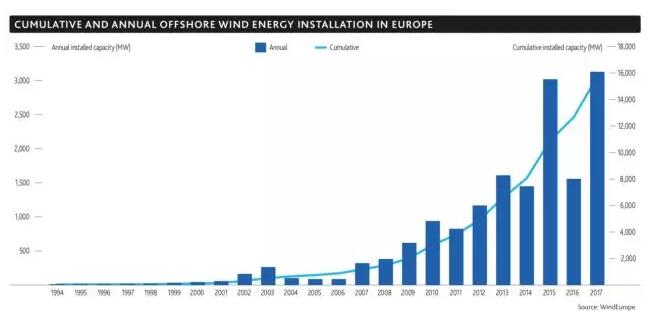 欧洲海上风电行业在2017年创下了新增装机3,148MW的纪录,达到2016年新增装机量的两倍。2017年共有14个项目上线,包括欧洲第一个漂浮式海上风电场(苏格兰Hywind)。在接下来的一年,将有6个海上风电项目在最终投资决议(FID)下完成安装。新投资总额75亿欧元,可覆盖2.5GW容量。
