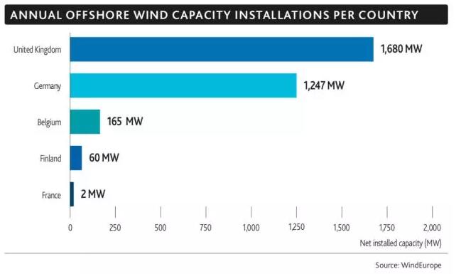 据GWEC年度报告,2017年欧洲投产的海上风电总装机容量中,有一半以上(53%)来自英国。德国为第二大市场,拥有欧洲总容量的40%;比利时占总份额的5%;芬兰启用了首个海上风电场。2017年欧洲新增装机容量前五位国家信息如下图: