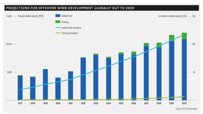 据预测,到2030年,全球海上风电总装机容量将达到120GW,在此之前,每年的装机容量都将超过10GW。得益于建设能力强和成本低的优势,欧洲将是主要的增长地区。此外,中国和美国也将做出较大贡献。