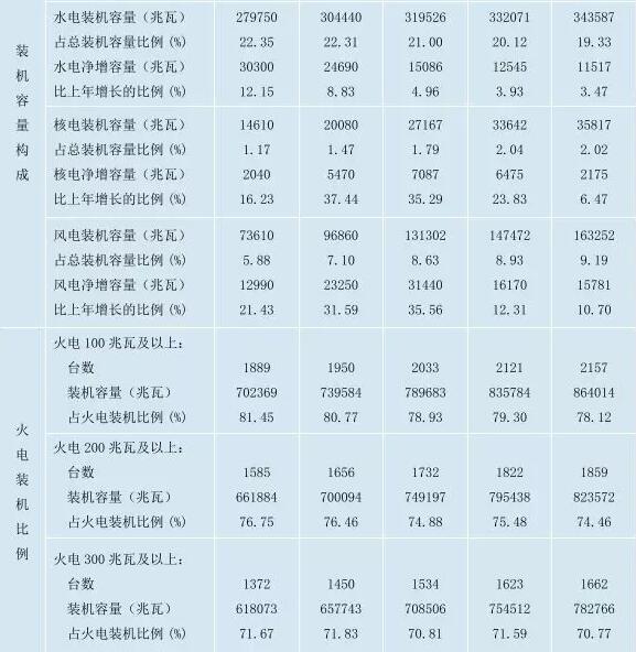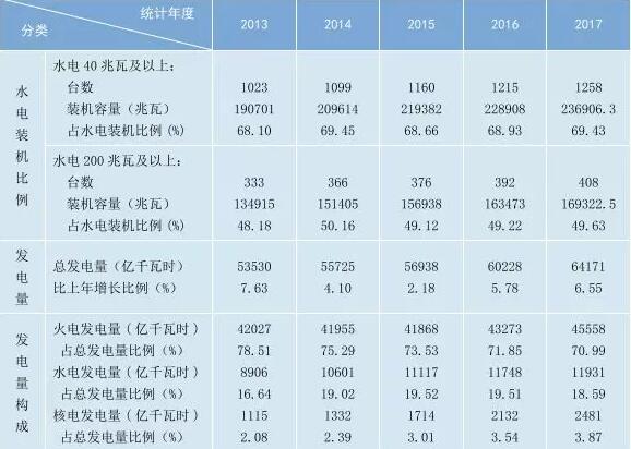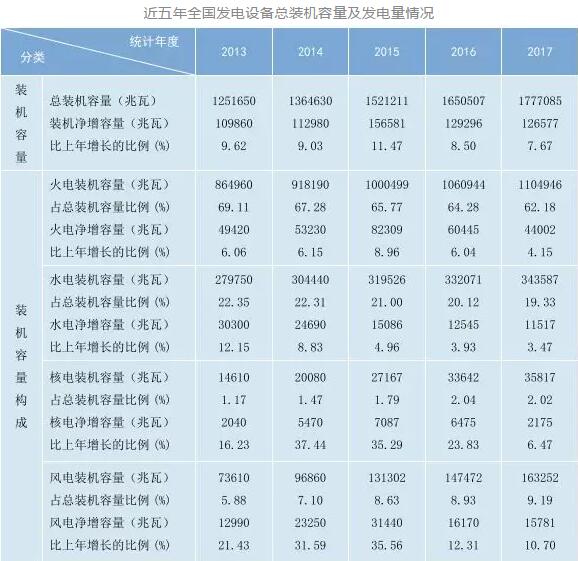 截止2017年底,全国发电装机容量达17.8亿千瓦,同比增长7.7%。其中火电装机11.0亿千瓦,占62.2%;水电装机3.4亿千瓦,占19.3%;核电装机3582万千瓦;风电装机1.6亿千瓦;并网太阳能发电装机1.3亿千瓦。2017年,我国非化石能源发电装机占全国总装机的38.8%,比2016年提高2.2个百分点;非化石能源发电量同比增长10.1%,占全国发电量的30.3%,比2016年提高了1.0个百分点。2017年,人均装机和年人均用电量分别达到1.3千瓦、4616千瓦时。
