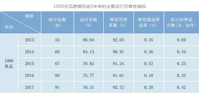 2017年纳入可靠性统计的1000兆瓦等级火电机组91台,均为燃煤机组,比2016年增加11台,容量增加0.11亿千瓦。2017年台年平均利用小时数5007.42小时,同比增加154.82小时。