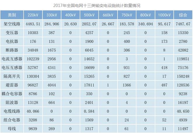 2017年全国电网220千伏及以上电压等级变压器、断路器、架空线路等十三类输变电设施运行可靠性