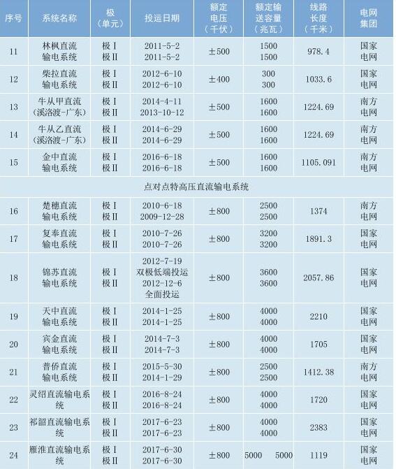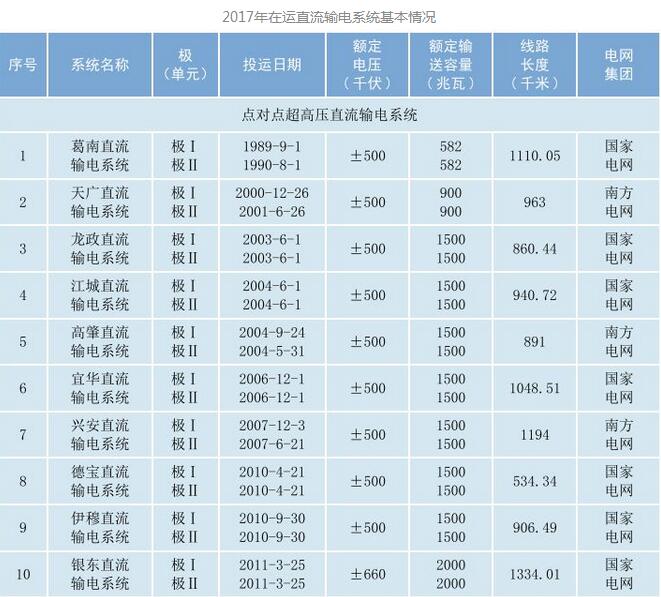 2017年,全国纳入可靠性统计的直流输电系统数量为27个,包括15个点对点超高压直流输电系统、9个点对点特高压直流输电系统和3个背靠背直流输电系统。额定输送容量总计111624兆瓦,线路总长度达到31221.57千米。