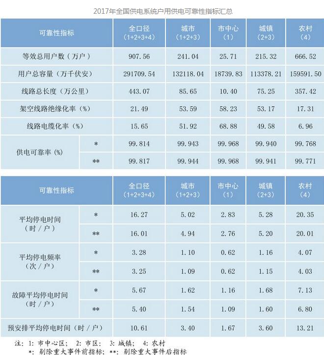2017年全国平均供电可靠率为99.814%,同比上升了0.009个百分点;用户平均停电时间16.27小时/户,同比减少了0.84小时/户,用户平均停电频率3.28次/户,同比减少了0.29次/户。
