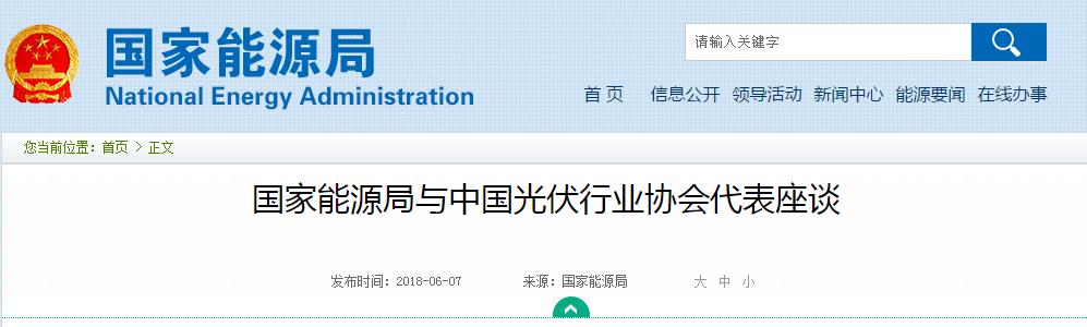 5月31日,国家发展改革委、财政部、国家能源局联合印发《关于2018年光伏发电有关事项的通知》,文件发布后,各方高度关注。为了解企业诉求,做好政策宣介,回应行业关切,6月6日上午,国家能源局新能源司与光伏行业协会部分企业代表进行座谈。中国光伏行业协会理事长、天合光能董事长高纪凡,阳光电源董事长曹仁贤,通威股份有限公司董事长刘汉元,隆基绿能科技股份有限公司董事长钟宝申,晶科电力科技股份有限公司董事长李仙德和阿特斯(中国)投资有限公司副总裁熊海波参加。