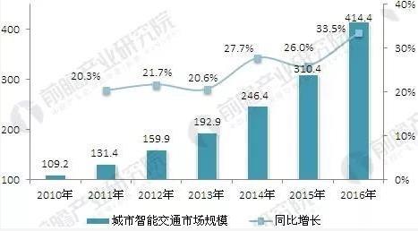据前瞻产业研究院发布数据显示,2014年我国城市智能交通市场规模达刡246亿,2011年-2014年复合增长率为24%;2016年市场觃模已经达刡414.4亿,增长率达33.5%,增长率再创历史新高。